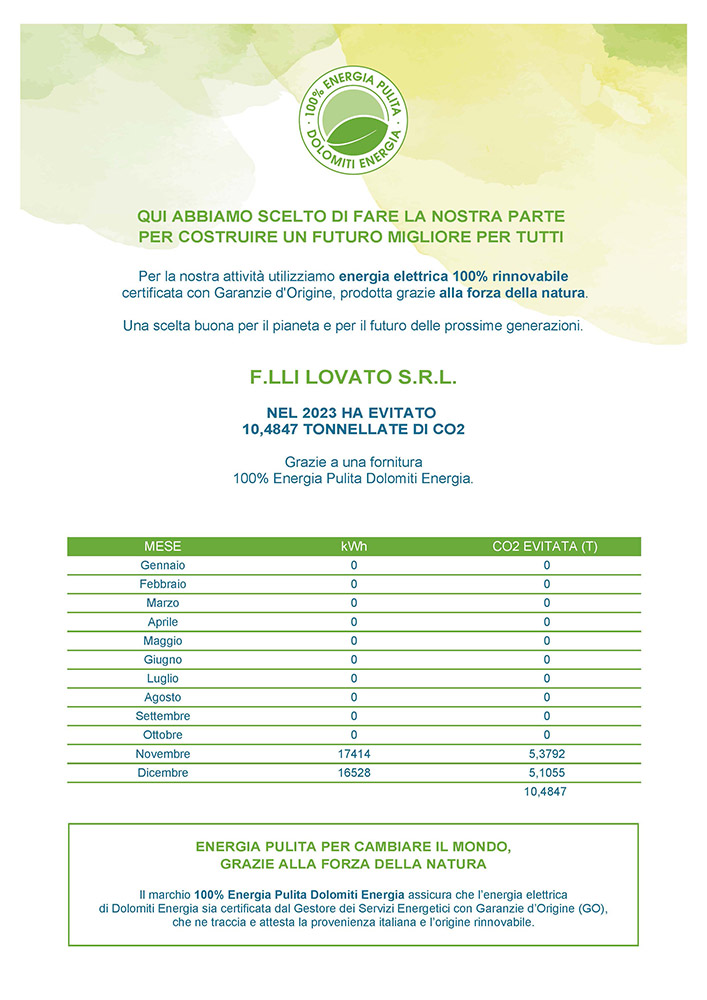 Per la nostra attvità utilizziamo energia elettrica 100% rinnovabile certificata con Garanzia d'Origine, prodotta grazie alla forza della natura.