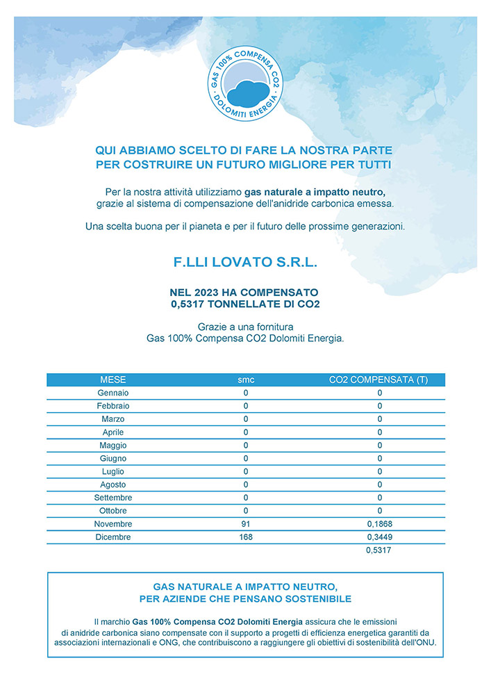 Per la nostra attività utilizziamo gas naturale a impatto neutro, grazie al sistema di compensazione dell'anidride carbonica emessa.
