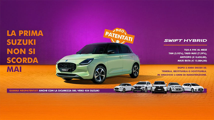 **IPT, PFU ed eventuali spese di rottamazione esclusi - presso i concessionari aderenti. La valutazione di eventuali vetture in permuta sarà effettuata in sede di sottoscrizione del contratto. Prezzo promo chiavi in mano calcolato con: incentivo Suzuki. L’offerta è applicabile per tutti i contratti stipulati dal 01/12/2025 al 31/12/2025. Verifica le promozioni di ogni singolo modello sul sito Suzuki.it . Verifica sempre sulle pagine promo dedicate i requisiti per accedere agli incentivi Suzuki.
